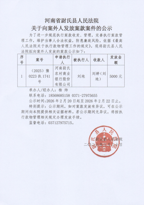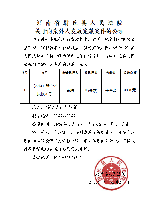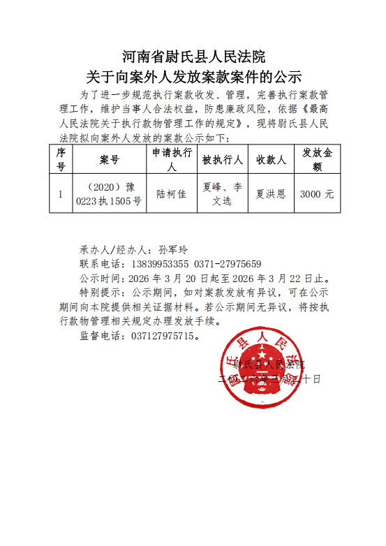 尉氏县人民法院关于向案外人发放案款的公示(第六十二期)