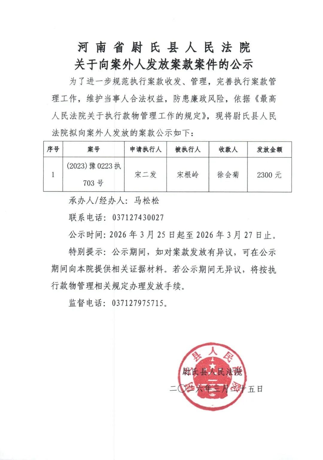 尉氏县人民法院关于向案外人发放案款的公示(第六十四期)